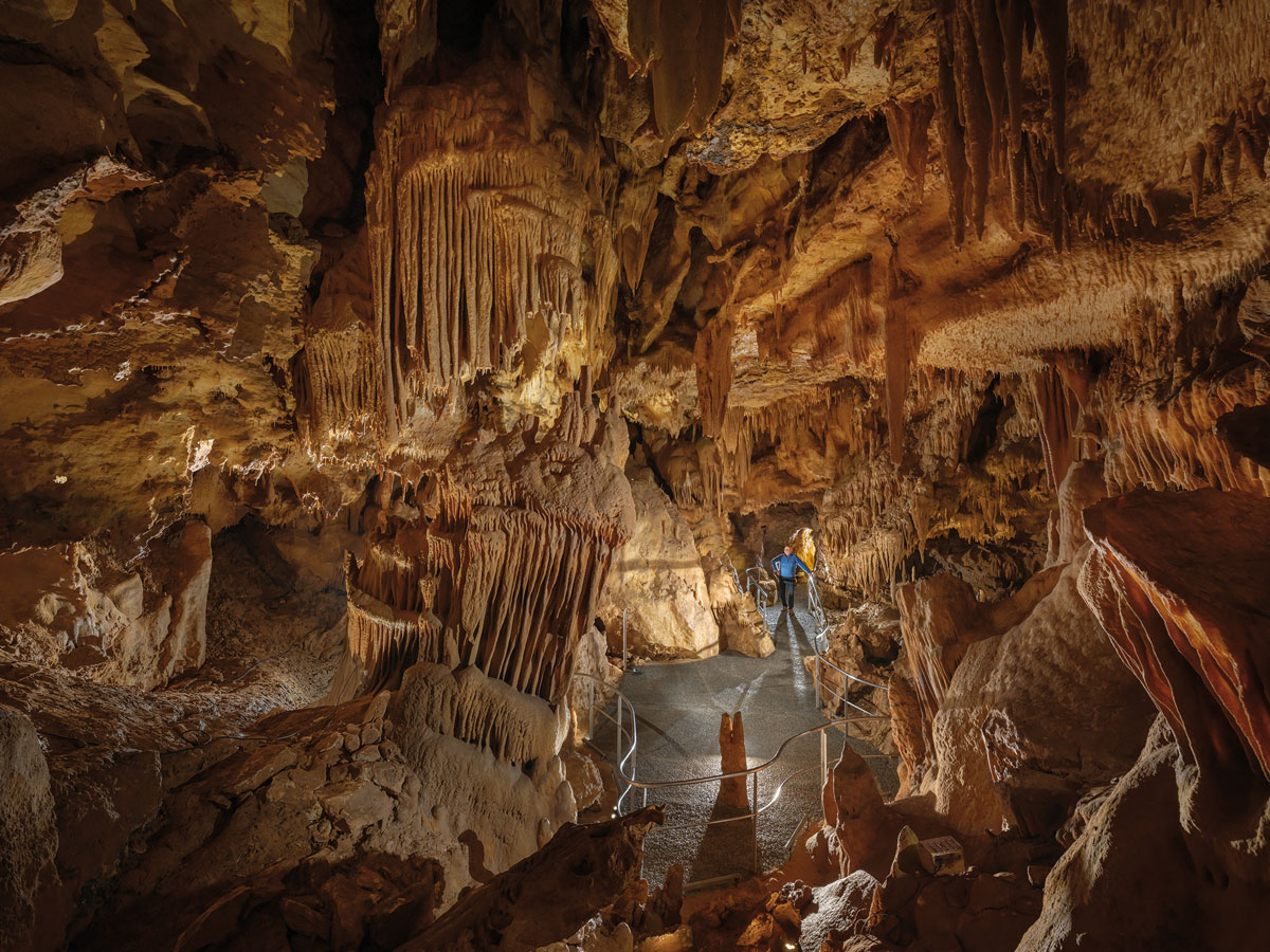 Vous pénétrez dans la grotte par un petit escalier qui vous emmène plus de 40 mètres sous terre. Dès que les lumières s’allument, le spectacle est au rendez-vous ! Stalactites, stalagmites, fistuleuses, draperies, coulées… Les concrétions naturelles qui ornent la grotte du sol au plafond sont d’une rare beauté ! Dans la plus grande salle, vous assistez à un spectacle de son et lumière qui évoque l’hibernation des ours et la rivière qui a creusé cette cavité naturelle pendant des millénaires. Enfin, le clou du spectacle : votre guide vous présente des peintures préhistoriques vieilles de 20 000 ans ! Un cheval, un bison, un homme… Laissées là par nos ancêtres, les peintures ont été peu à peu recouvertes par le calcite qui leur donne une couleur bleue unique. Une démonstration insolite de la collaboration entre l’homme et la nature !